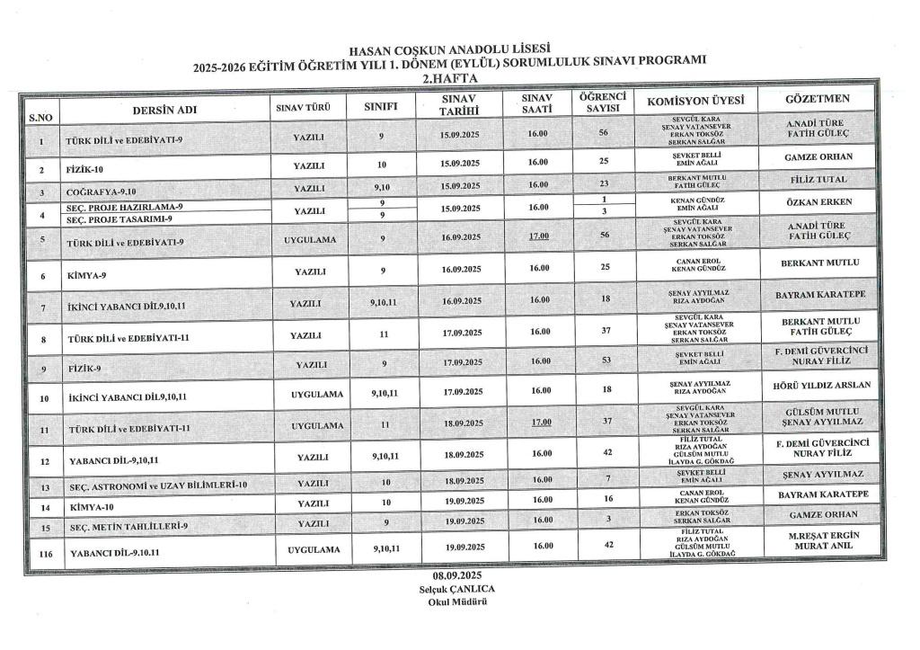 EYLÜL DÖNEMİ SORUMLULUK SINAV PROGRAMI.